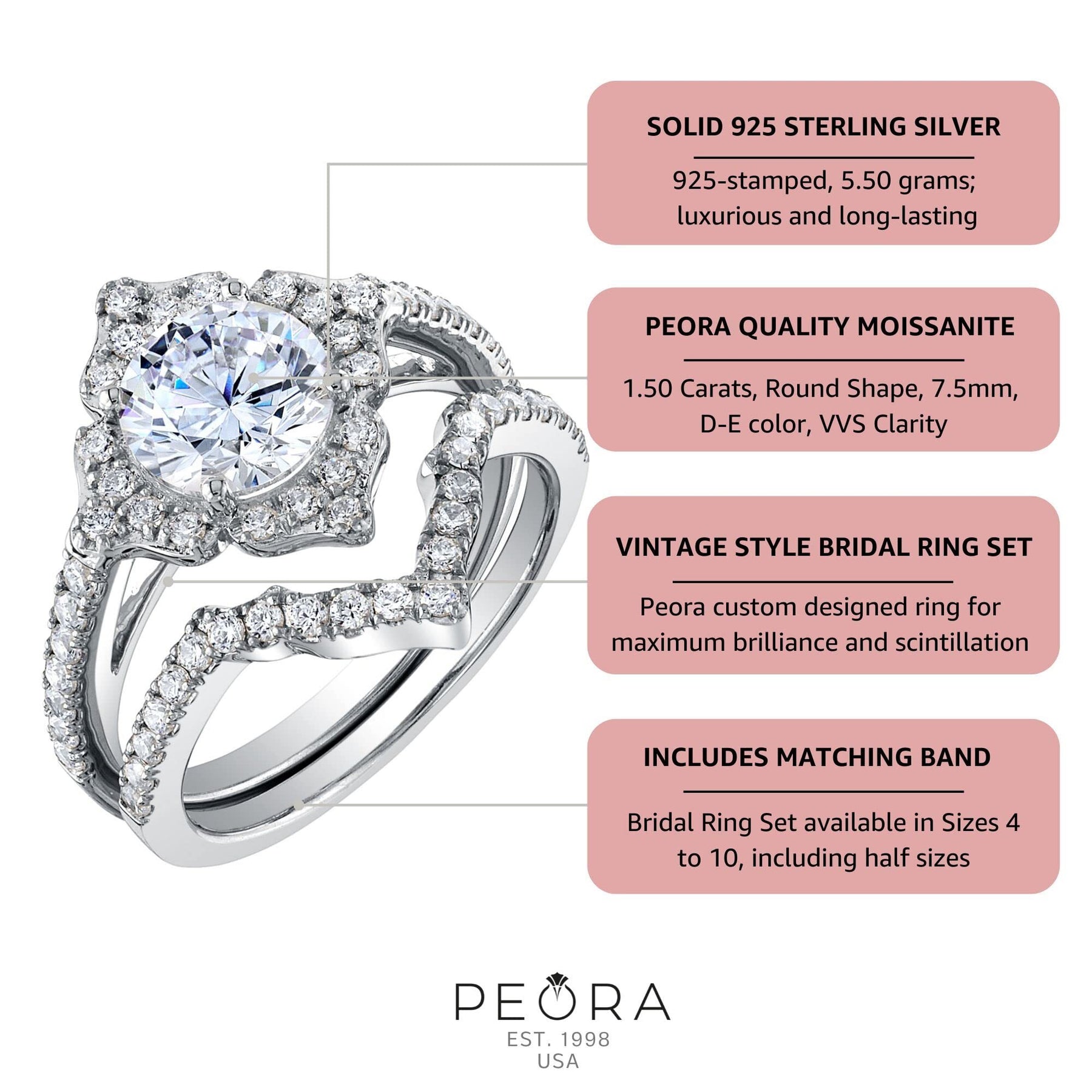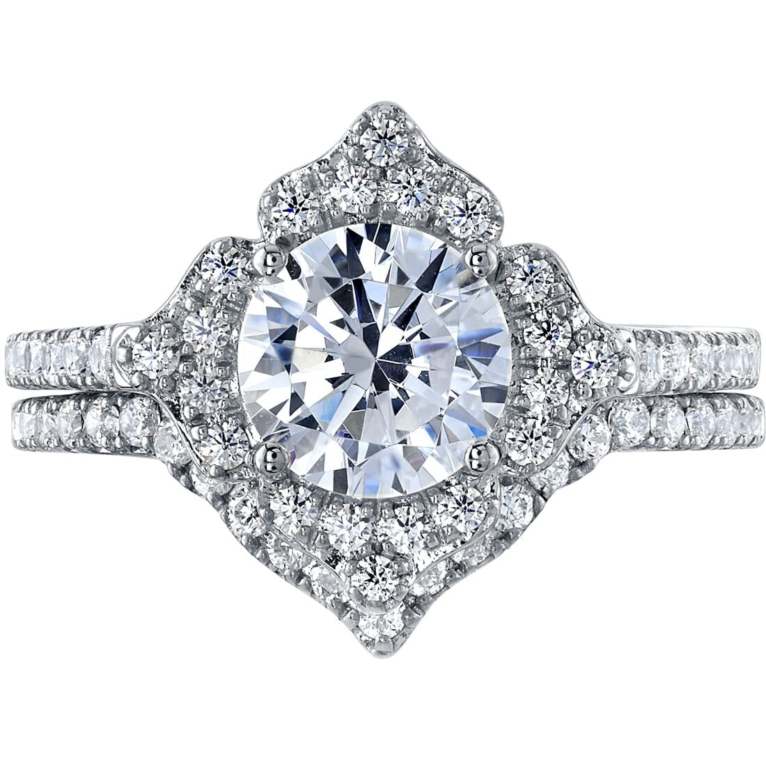 Crafted by master artisans, each engagement ring features sustainable center stones with matching accents in every wedding band.